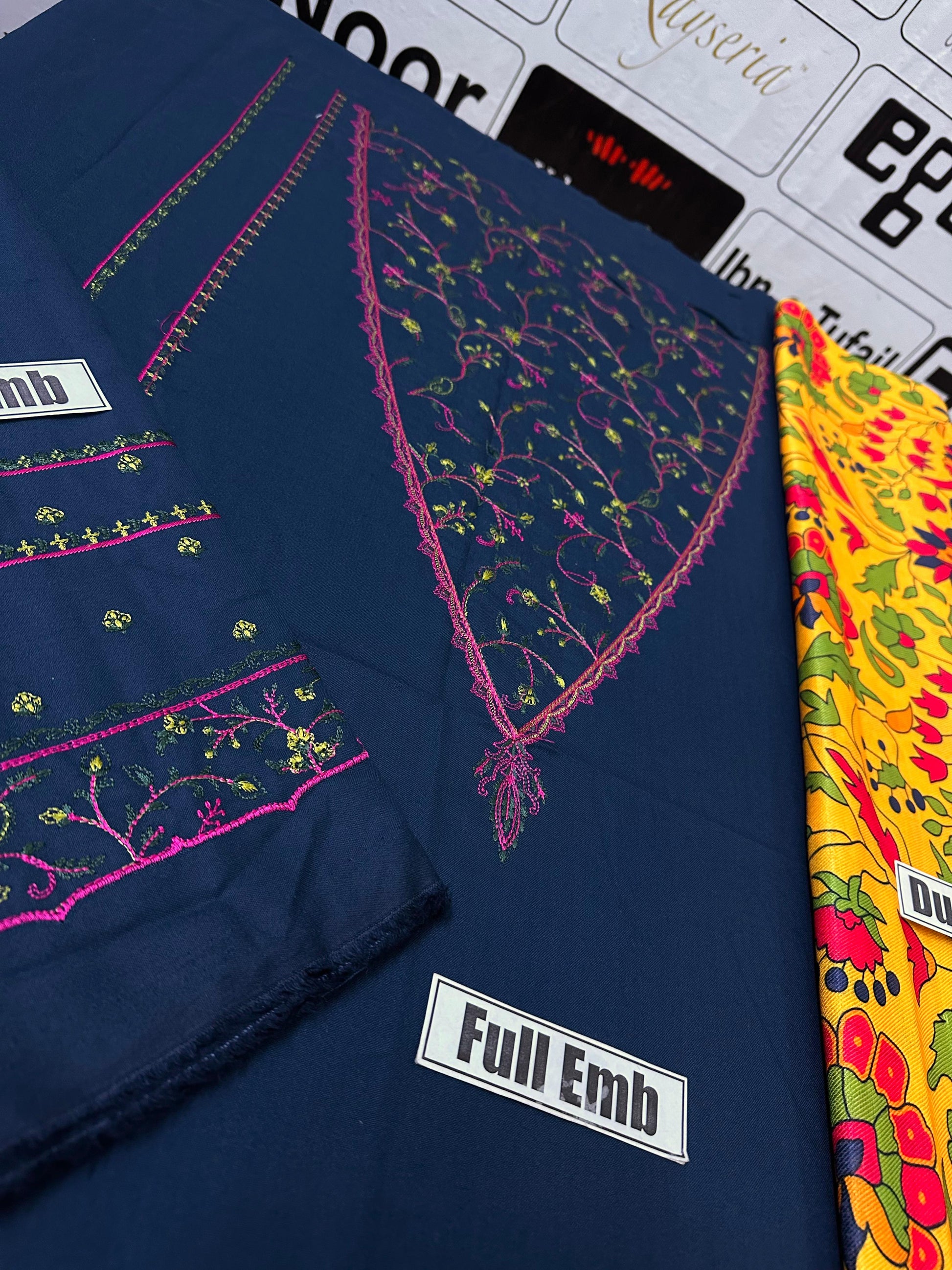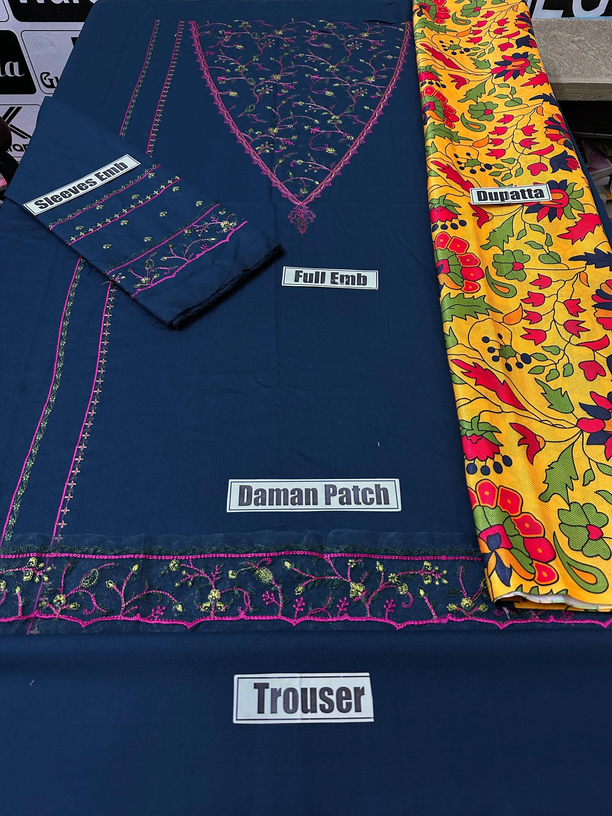 High Quality Dhanak Fabric Dhanak Embroidered Shirt with Daman Patch Dhanak Embroidered Sleeves Dhanak Plain Back & Trouser Dhanak Print Dupatta Unstitched 3PC Dress